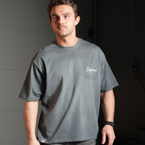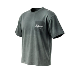 The defining element is the removed pocket imprint — a subtle nod to construction and deconstruction — leaving behind a tonal Infamous mark where the pocket once sat. The effect is understated and intentional, creating visual interest without excess branding.