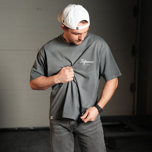 Constructed from premium 220 GSM cotton, this mid-weight silhouette balances structure and softness for everyday wear. The garment-washed grey finish introduces tonal depth while maintaining a clean, controlled appearance.
